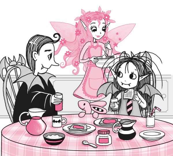 Дома я сразу же отправилась на кухню за моим любимым лакомством – поджаренным хлебцем с арахисовым маслом. Папа уже как раз поднялся после дневного сна – он ведь у меня вампир, поэтому спит днём, а не ночью. Он сидел за столом, попивая свой любимый томатный сок.