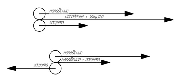 Если рассуждать грубо, то можно выделить всего два вида атаки: направленная от защищающегося (когда тянут) и в его сторону (элементарный удар любого характера). В первом случае инстинкт самосохранения подсказывает: нужно попытаться вырваться! Вас тащат в одну сторону, вы же пытаетесь преодолеть эту силу и оказать противодействие в обратном направлении. В результате своего добивается тот, кто сильнее физически. Более того, инициатор этого конфликта, тянущий вас за собой, подсознательно уже готов к сопротивлению и ждёт этого от жертвы. Согласие с тянущим движением, во-первых, станет для нападающего неожиданностью, и все его дальнейшие агрессивные планы, скорее всего, тут же разрушатся или как минимум сильно изменятся, благодаря чему у вас будет время предпринять защитные действия. Во-вторых, так мы получаем возможность усилить импульс противника, добавив к нему свой. С таким подходом соглашается элементарная векторная геометрия и физика сложения сил. Поясню на визуальном примере.