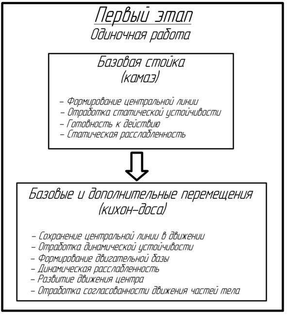 На начальном этапе ученику следует уделять особое внимание выстраиванию своего тела через отработку стойки. Мы учимся правильно распределять вес между ногами в статичном положении, располагать руки, доворачивать бёдра, устремлять вперёд взгляд и энергию, расслаблять плечевой пояс, ощущать центр в камаэ. Здесь же должна осуществляться мысленная работа: анализ своих ощущений, коррекция положения тела в зависимости от них, настройка на предстоящие действия. Параллельно с отработкой стойки ученики начинают знакомиться с основами эффективного передвижения, сначала – через изучение базовых и дополнительных перемещений. Здесь необходимо в индивидуальном движении попытаться сохранить сформированные на определённом уровне принципы и ощущения в статичном положении плюс постигать новые. Это, очевидно, более сложная задача, но именно такая наработка закладывает основу будущей эффективности.