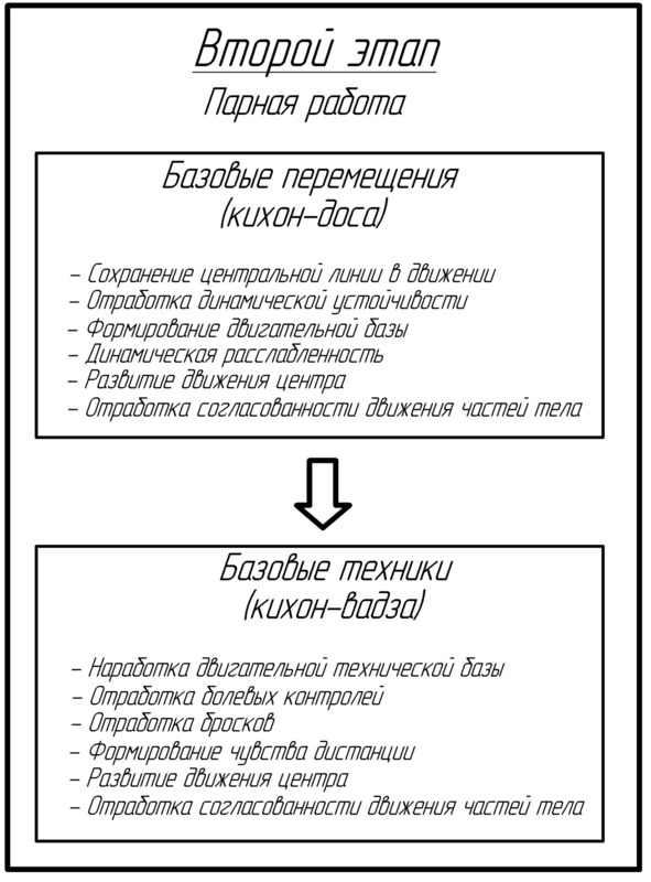 Второй этап роста предполагает работу в паре, где необходимо учиться основам взаимодействия с энергетикой партнёра, его физическим воздействием. Одиночные базовые упражнения трансформируются в парные, в процессе отработки которых ученик совершенствует индивидуальные наработки, пытается добиться той же эффективности в движениях при физическом контакте с напарником. Затем происходит отработка базовых техник, пошаговое оттачивание известных и постижение более комплексных принципов айкидо. Броски и техники удержания здесь выполняются чётко, с остановками и кропотливой корректировкой своего тела в каждой фазе, значительно расширяется диапазон условий, в которых можно протестировать своё равновесие, центральную линию, эффективность работы центра и т. д. Если на первом этапе происходит формирование статичной и динамичной базы, то на втором – закладываются технические основы.