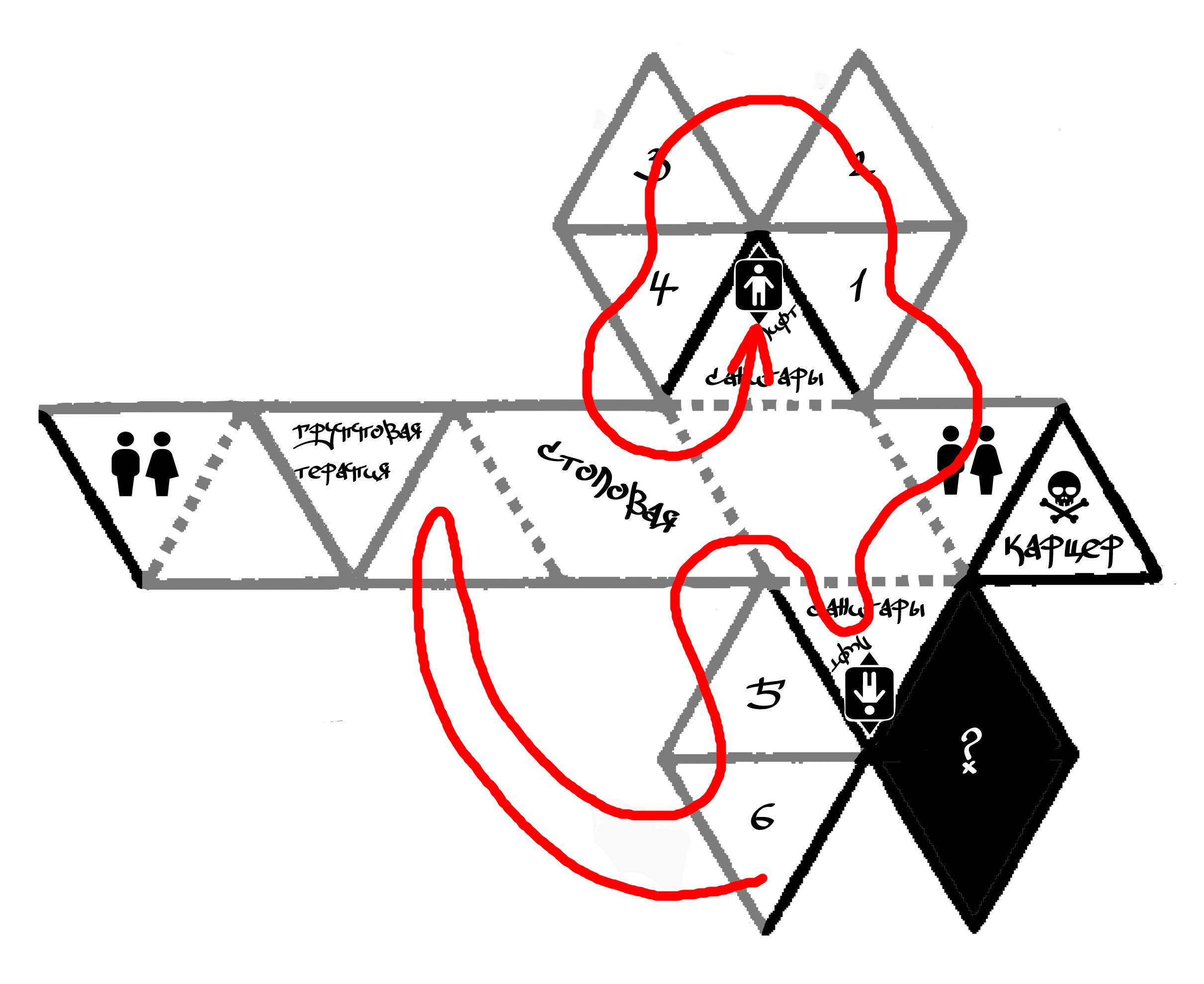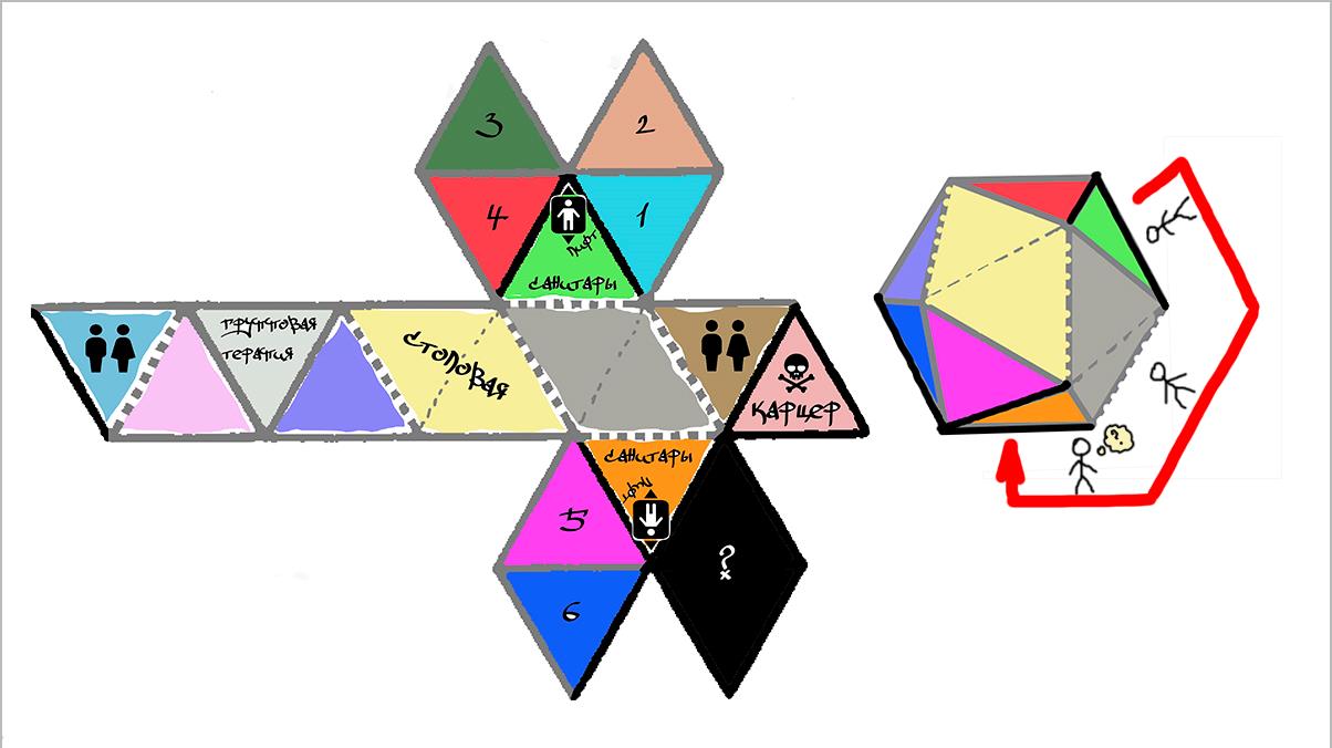 На самом деле схему бентоса следовало не расправить, а скомкать. Потому что череда пирамидальных комнат складывалась в икосаэдр: