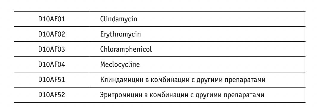 Код АТХ позволит вам посмотреть сопоставимые или аналогичные препараты, из которых сложится конкурентное окружение в самом широком формате. Так, например, вам достался препарат Далацин-гель. По его коду D10AF01, обратившись к АТХ-классификации, вы видите, что препарат от- носится к классу D – «Препараты для заболеваний кожи», в которой группа D10 – «Препараты для лечения угрей», а под- группа D10AF – «Противомикробные препараты для лечения угрей для наружного применения», которая представлена следующими позициями: