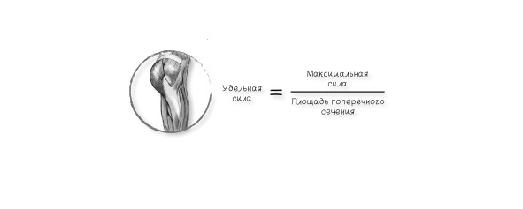 Настал момент генерировать силу. Мозг посылает сигналы, которые движутся вниз по двигательному нерву, пока не достигнут нервно-мышечного соединения. Затем происходит куча вещей, заставляющих мышцы сокращаться, генерируя силу. Существует довольно большое количество факторов, которые могут влиять на фактическую создаваемую силу. Но наибольшее значение здесь имеет физиологическая площадь поперечного сечения мышцы или мышечных волокон. Итак, представьте, что вы взяли какую-либо мышцу и разрезали ее перпендикулярно к длине в центре. Диаметр позволит вам рассчитать площадь поперечного сечения. Количество силы, которое может генерировать мышца, называется удельной силой. Удельная сила – это максимальная сила (наибольшая сила, которую способна создать нервно-мышечная система при максимальном произвольном мышечном сокращении; ваш 1ПМ в кг, хотя для большей точности в лабораторных условиях используют электрическое раздражение) деленная на площадь поперечного сечения (в квадратных сантиметрах).
