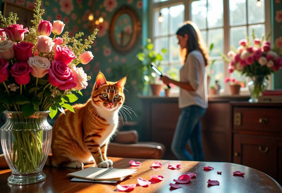 Обычно мой кот встречал меня у двери, тёрся о ноги и громко мурлыкал, требуя ужин и внимание. Но сегодня он сидел в коридоре и смотрел в сторону гостиной, где я поставила букет, с каким-то подозрительным выражением морды. Когда я попыталась взять его на руки, он зашипел и спрыгнул на пол.