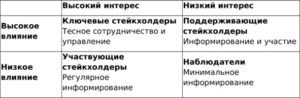 Высокий интерес / Высокое влияние: Ключевые стейкхолдеры, требующие активного управления и тесного взаимодействия.