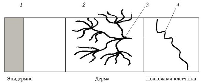 1 – роговой слой; 2 – капиллярный слой; 3 – сеть капилляров; 4 – кровеносный сосуд