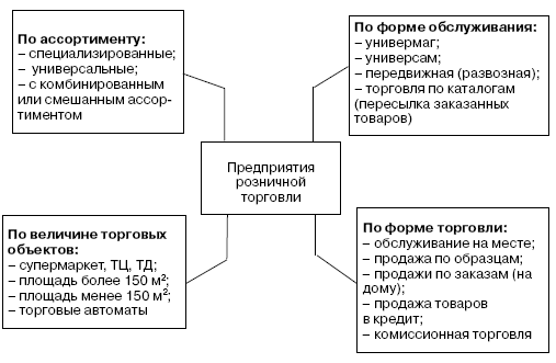 Розничная торговля может осуществляться самыми разными способами, торговые предприятия – являться единичными или образовывать торговую сеть, любой магазин может специализироваться на продаже того или иного вида товаров. Принято несколько классификаций торговых предприятий, которые сведены в общую схему (рис. 1).