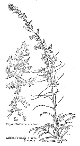 An odd-looking plant, with very pretty, feathery flower-clusters. The hairy stem is over a foot tall and the leaves are bright yellowish-green and mostly smooth on the upper side, with hairy margins and hairy on the under side. The flowers are a warm shade of bright golden-yellow and form a handsome, rather flat-topped cluster, with long stamens, and the oblong pods are an inch long or less, flat and much broader than those of the last. The flowers are slightly sweet-scented and the whole plant exudes a faint unpleasant odor. This is conspicuous on the dreary mesas around Reno, often growing with Cleomella longipes, which it very much resembles in general appearance, except for the pods, which are quite different.