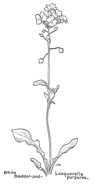 There are a good many kinds of Lesquerella, all American; low plants, more or less hairy or scurfy; flowers mostly yellow, in clusters; petals without claws; pods roundish, more or less inflated, and giving the common name, Bladder-pod, also used for Isomeris arborea.