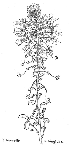 There are many kinds of Cleome; ours are branching herbs, with palmately-divided leaves; the flowers with four sepals, four petals, and six stamens. The ovary has a stalk with a gland at its base and becomes a long pod, with a long stalk and many seeds.