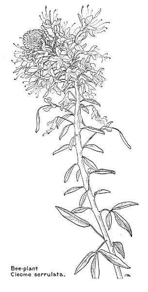 In Arizona this exceedingly handsome plant often covers the dry beds of rivers with acres of beautiful color. The smooth, branching stem is sometimes as much as eight feet high. The upper leaves are long and narrow and the lower are larger and usually have three leaflets, but all are bluish-green and peculiarly soft and smooth to the touch. The buds are purple and the delicate flowers, with threadlike flower-stalks, grow in a handsome, feathery cluster, sometimes a foot long, with numerous bracts. They have four, pinkish-lilac or white petals and six exceedingly long, threadlike stamens with minute, curling, green anthers. The lilac pistil is also very long and before the flower drops off begins to develop into a small, flat, green pod. These gradually lengthen, until the stem is ornamented with many hooklike pods, with slender stalks, hanging all along it. Many of the flowers do not produce fruit. The foliage when it is crushed gives off a rank, unpleasant smell, which is responsible for the local name of Skunk-weed. This is widely distributed and is found in the central and northern part of the United States, as well as in the Southwest.