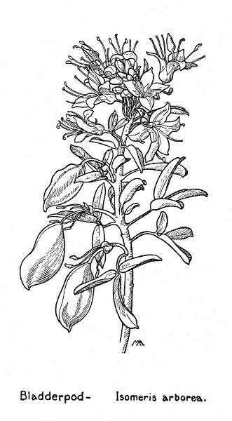 This is a shrub about three feet high, which is attractive except for its unpleasant smell. The leaves are smooth, toothless, stiffish and thickish, and bluish-green, with a small bristle at the tip, and mostly with three leaflets. The pretty flowers are nearly an inch across and warm yellow in color, not very bright but pretty in tone, with six very long, yellow stamens, and form a short, oblong cluster. The ovary has such a long stalk, even in the flower, that it gives an odd appearance and it develops into a very curious and conspicuous, drooping pod, an inch and a half long, much inflated and resembling a very fat pea-pod, on a long stalk, with two rows of seeds like little peas inside it, which taste very bitter. This is quite common on southern mesas. The name Bladderpod is also used for Lesquerella, which belongs to the Mustard Family.