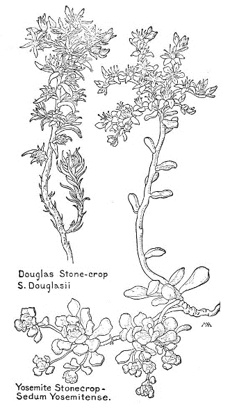 On moss-covered rocks, moistened by the glistening spray blowing from the Yosemite waterfalls, we find these beautiful plants, covering the stones with a brilliant, many-colored carpet. The flowers are stars of brightest gold, about half an inch across and delicately scented, and form flat-topped clusters, three or four inches across. The upper part of the stalk, which is about six inches tall, and the upper leaves are delicate bluish-green, but both stem and leaves shade to vivid scarlet at the base. Spreading out on the ground from the base of the stem in all directions are numerous little runners, each bearing at the end a small rosette of thick, blue-green leaves, forming a beautiful contrast to the vivid color of flowers and stems. The leaves and runners are very brittle and break off at a touch.