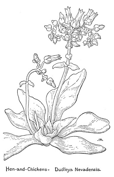 There are several kinds of Dudleya; perennials, very thick and fleshy; root-leaves in a conspicuous rosette, stem-leaves mostly bract-like, usually with a broad, clasping base; flowers mostly yellow or reddish; calyx conspicuous, with five lobes; petals united at base; stamens ten. Most of these plants grow in the South, often on rocks, in such shallow soil, that they would die in dry weather, except that the juicy leaves retain their moisture for a long time and nourish the plant. They resemble Sedum in appearance, but as the petals are more or less united the flowers are not starlike. The Indians make poultices out of the leaves.