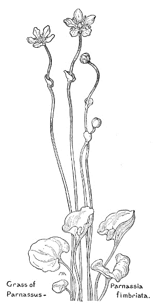 There are several kinds of Parnassia, of north temperate and arctic regions; smooth perennials; leaves toothless, almost all from the root; flowers single; sepals five; petals five, each with a cluster of sterile filaments, tipped with glands, at the base; fertile stamens five, alternate with the petals; ovary superior, or partly inferior, with a very short style, or none, usually with four stigmas; fruit a capsule, containing numerous winged seeds. These plants were called Grass of Parnassus by Dioscorides, but are not grasslike. They resemble the other members of this family so little that they have been made into a separate family by some botanists.