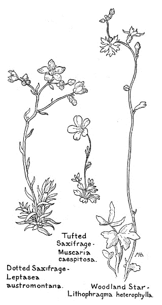 There are a good many kinds of Lithophragma, perennials, bearing bulblets on their slender rootstocks and sometimes also on the stems; leaves more or less divided, mostly from the root; stipules small; flowers few, in a loose, terminal cluster; sepals five; petals five, white or pink, with claws; stamens ten, short; ovary superior or partly inferior, with three short styles.