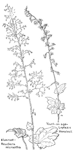 There are a good many kinds of Heuchera, North American, difficult to distinguish; perennials, with stout rootstocks; leaves mostly from the root; flowers small, in clusters; calyx-tube bell-shaped, with five lobes; petals small, sometimes lacking, on the throat of the calyx, with claws; stamens five, inserted with the petals; ovary partly inferior, with two slender styles, becoming two beaks on the capsule.