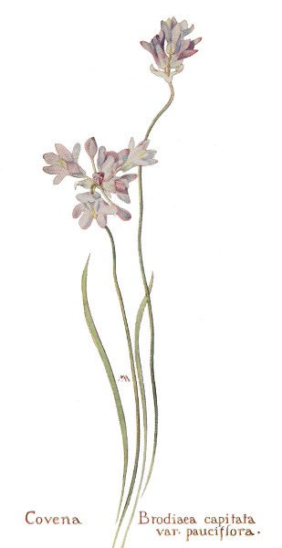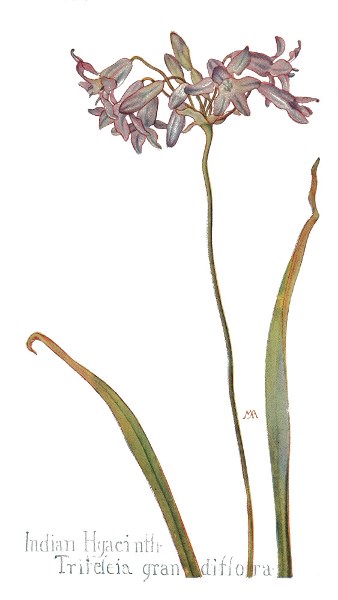 Though the general appearance of the plant is very different, the individual flowers of this beautiful plant very much resemble the bells of a Hyacinth, for they have the same waxy, semi-translucent texture. The bluish-green leaves, folded lengthwise and withering before the flower, are sometimes a foot long and the flower-stalk often reaches a height of two feet and bends beneath the weight of its lovely crown of blossoms. The cluster has four papery bracts at the base and is from three to four inches across, comprising about a dozen flowers, each nearly an inch long. They are pale-violet, with a bright-blue mid-vein on each division, the general effect being blue, with a white pistil and six stamens in two rows, all with blue anthers and the outer ones with broad, white filaments. It is wonderful to find these lovely and exotic-looking flowers, delicately scented, gleaming in the shadow of a dusky oak thicket or a deep canyon. They last a long time in water, becoming papery as they wither.