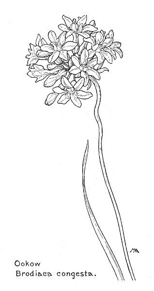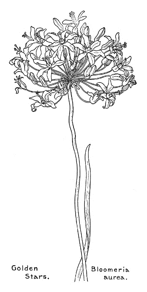 In late spring the meadows around Pasadena and other places in the Coast Range are bright with pretty clusters of Golden Stars. The plant is from six to eighteen inches tall, springing from a small bulb, covered with brown fibers, with a long, narrow, grasslike leaf, and a large flower-cluster, sometimes comprising as many as fifty blossoms, at the top of the stalk. The flowers, about an inch across, with pedicels from one and a half to two inches long, are orange-yellow, the spreading divisions each striped with two dark lines, and the anthers are bright green. This looks very much like Golden Brodiaea, but the latter has no cup at the base of the stamens. It grows in the southern part of California and is abundant wherever it is found. B. Clevelandi is much the same, but the flowers are striped with green and the numerous buds are green, so that it is less golden and the general effect is not so good. It has numerous narrow leaves.