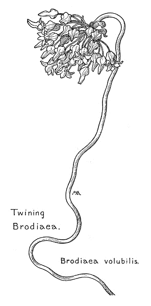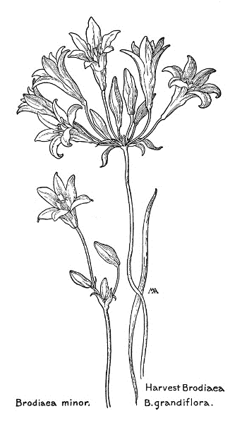 In early June, at the time of the hay harvest, these handsome flowers, which look like clusters of little blue lilies, begin to appear among the dried grass of the hillsides and in open places in the woods. They vary in height from a few inches to over a foot and the number of flowers in a cluster also varies very much. Sometimes there are as many as ten of the beautiful blossoms, an inch or more long, with pedicels unequal in length and from one to four inches long, in a large cluster at the top of the stalk, with several, whitish, papery bracts at the base of the cluster. The color of the flowers is usually a deep bright blue shading to violet and the six divisions grow paler toward the base and have a brown stripe on the outside; the buds are greenish, striped with brown. The stamens are translucent white, three ordinary stamens, with long erect anthers, alternating with three without anthers, the latter tongue-shaped and petal-like. The leaves, which are thickish and about the same length as the stalk, have withered away before the flowers bloom. This plant very much resembles Ithuriel's Spear, Triteleia laxa, but three of the stamens are without anthers and the ovary is not on a long stalk. It is the commonest kind around San Francisco. B. minor is much the same, but a smaller plant with fewer and smaller flowers. The three outer divisions are narrow, with pointed tips, and the inner blunt and broad, and the sterile stamens are notched and longer than the fertile ones. This grows on dry hills and plains in middle and southern California.
