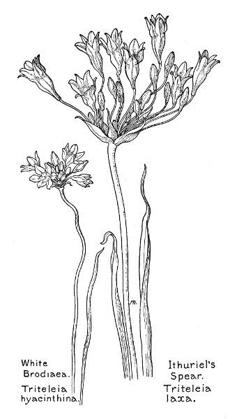 Very much like Harvest Brodiaea but rather taller, with more flowers in the cluster, and less waxy in texture, varying in color from blue to violet and occasionally white. This is common on hillsides and in adobe fields. The rather fanciful name was suggested by the spear carried by Milton's angel Ithuriel.