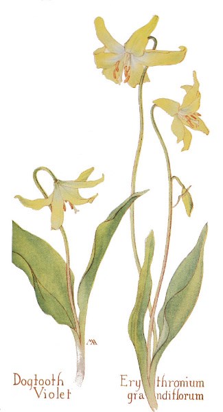 There are a good many kinds of Erythronium, all but one from North America, and, East and West, they are among our prettiest flowers. They have deep, membranous-coated, solid bulbs; a pair of netted-veined, unequal leaves, sometimes mottled with brown; flowers without bracts, large, nodding and bell-shaped, with usually six divisions, all colored alike, the tips turning back, each with a nectar-groove, and each with two or four little scales at base, or only the three inner divisions with scales; stamens on the receptacle, anthers not swinging; style more or less three-lobed; capsule more or less oblong and three-angled. The younger plants are often flowerless, with only one broad leaf, with a long leaf-stalk. The name is from a Greek word meaning "red," though these flowers are mostly yellow. The common name, Dog-tooth Violet, is old, and suggested by the little, white, toothlike offshoot often found on the bulb, but of course they are not in the least like Violets. In California they are often called Chamise Lily, and sometimes Adam and Eve, because the plant often bears a large and a small flower at the same time. Mr. Burroughs would like to call it Fawn Lily, on account of the mottled leaves of some kinds, which slightly suggest the ears of a fawn. Adder's-tongue, probably suggested by the long forked pistil, is also an old and usual name.