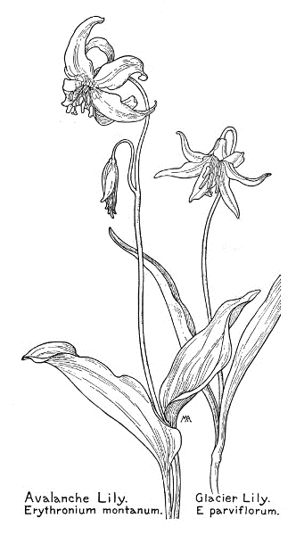 A lovely flower, much like E. grandiflorum, but the anthers are white or pale yellow. Around Mt. Rainier these beautiful plants often grow in large patches at the edge of the snow, alongside of the Avalanche Lily, E. montanum, but the two kinds do not seem to mingle.