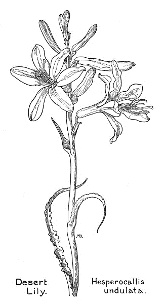 This is the only one of its kind, a wonderfully beautiful desert plant, much like an Easter Lily. The stout, pale, bluish stem, from six inches to two feet tall, has a delicate "bloom" and springs from a graceful cluster of narrow leaves, which are a foot and a half long, spreading widely, but not lying quite flat on the ground. They are pale bluish-green, with a narrow, crinkled, white border and folded lengthwise. The buds are bluish and the lovely flowers are about three inches long and pure-white, delicately striped with pale-green and blue on the outside, with yellow anthers and a white stigma, and with a papery bract at the base of each pedicel. The flowers are slightly fragrant and become papery and curiously transparent as they wither. In dry seasons these plants do not bloom at all, but the slightest moisture will cause them to send up a stout stem and crown it with exquisite blossoms, which look extraordinarily out of place on the arid desert sand around Yuma and Ft. Mohave. The bulb is eaten by the Indians.