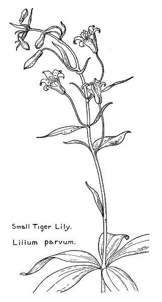 A good deal like the last, but not so large. The petals are more turned back and they are orange-color all over, dotted with dark-red, and the anthers are pale orange-color, ripening to golden-brown. This is common in the Hood River Valley.