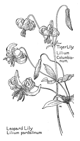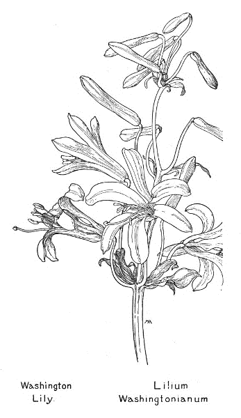 In the Sierras, at an altitude of from three to over seven thousand feet, and as far north as the Columbia River, we may be fortunate enough to find this glorious Lily, growing in the forest in moderate shade and protected by the chaparral. It is not rare but nowhere very abundant. I shall never forget finding a group of three or four, growing near a huge fallen tree, in the woods at Wawona near Yosemite, where it is very fine. Their raiment is even more "white and glistering" than the cultivated Easter Lilies. The smooth, stout, purplish stem is from two to five feet high, adorned all the way up with successive whorls of handsome dark-green leaves, three or four inches long, thin in texture, with rippling margins, and shining as if they had been varnished. There are from two to twenty blossoms of shining white, each one from three to four inches long and as much across. The petals are cleft to the base, spreading wide apart when the flower is fully open, sometimes finely dotted with purple, and becoming purplish in fading. The anthers are yellow and the pistil green, and the bulb is large, with thin scales. The scent is delicious, having a whiff of spicy carnation added to the usual lily fragrance. This is never found in the Coast Range and is the only pure white American Lily. Shasta Lily is a variety with a small bulb. L. Párryi, the Lemon Lily, of southern California and Arizona, is similar in the form of its flowers, which are large and clear yellow, dotted lightly with deeper yellow. It grows in shady, moist spots in cool canyons and is very beautiful.