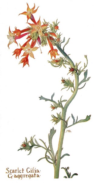 Very pretty flowers, which attract attention because of their unusual coloring. The leafy stem is from one to two feet tall and slightly downy and the leaves are generally toothless, smooth, and rather dark green. The flowers form a roundish terminal cluster, which is about two inches across, surrounded by broad bracts, which are sticky to the touch. The corolla is funnel-form, about an inch long, various shades of buff or salmon-color, and as the downy buds are yellow, the newly-opened flowers buff, and the older ones pinkish or cream-white, the combinations of color are odd and effective. This is quite common in Yosemite, in warm situations, and much cultivated in Germany. It is sometimes called Wild Bouvardia, but this is a poor name, as it is that of a plant belonging to an entirely different family.