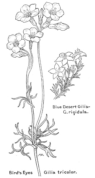 The general effect of this plant is inconspicuous, though the flowers are quite pretty close by. The roughish woody stem is only a few inches tall and then branches abruptly into several long sprays, clothed with many very small, narrow, pointed, thickish, dull green leaves and ornamented towards the end with small clusters of flowers, which are lilac or blue, marked with purple lines, less than half an inch across, with five irregular lobes and blue anthers. This grows at the Grand Canyon and in dry open places in the mountains.