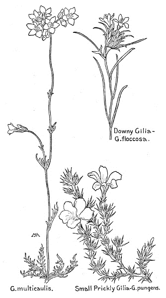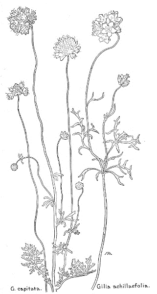 This varies a good deal in color and beauty. The stems are smooth and slender, from one to two feet tall, and the leaves are alternate, smooth or downy, delicately cut into many fine divisions. The numerous small flowers are funnel-form, with projecting stamens, and form a close round head, which is an inch or more across, without bracts. The calyx is more or less woolly, with sharp triangular teeth, the tips turned back. Usually the flowers are blue of some shade, deep or pale, sometimes forming patches of color in the fields, but the prettiest I have seen grew in the woods near Santa Barbara, the individual flowers larger than usual and pure white, with bright blue anthers. It is common in Yosemite, but rather dull bluish-white and not pretty.