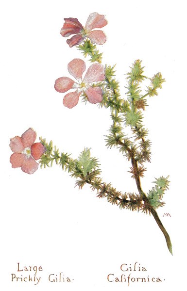 An unusual-looking, conspicuous, shrubby plant, suggesting some kind of small prickly pine or cedar, with lovely flowers. It forms large straggling clumps, about two feet high, with many woody stems and rich-green foliage, the leaves cut into small, spreading, needle-like lobes, and ornamented with numbers of brilliant flowers. They are an inch or more across, with bright pink petals and a white "eye," and are most delicate in texture, with a satiny sheen and smelling sweet like violets. This grows on hills and is very beautiful on Mt. Lowe.