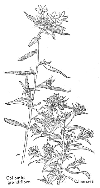 There are several kinds of Collomia, almost all annuals; leaves alternate, usually toothless; flowers in clusters; differing from Gilia and Linanthus in the calyx, which increases in size as it grows older; corolla tube-shaped, funnel-form, or salver-form, with spreading lobes; stamens unequally inserted on the corolla-tube, with unequal filaments; seeds usually mucilaginous.