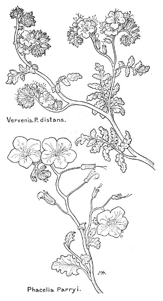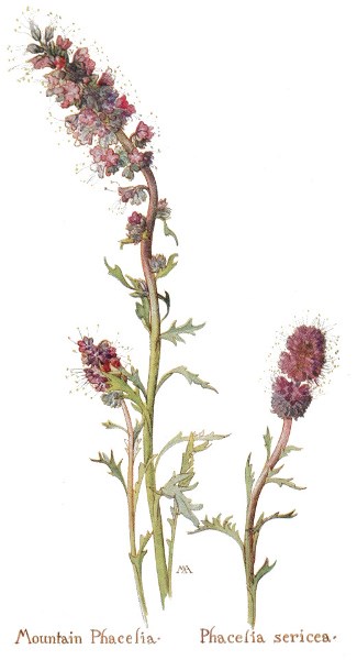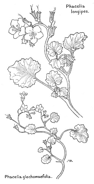 Charming flowers, though the foliage is rather too hairy. The stout, reddish stems are hairy, brittle, and loosely branching, about a foot tall, and the leaves dull green and hairy. The handsome flowers are in graceful nodding clusters, with a bell-shaped corolla, about an inch long, a rich shade of bluish-purple, the long conspicuous stamens and pistils giving an airy look to the blossoms. The filaments are purple and the anthers almost white and, as in other Phacelias, when the corolla drops off the long forked style remains sticking out of the calyx like a thread. This grows in light shade in rich moist soil in the hills.
