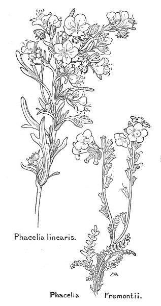There are many kinds of Phacelia, hairy plants, with no appendages between the sepals; resembling Hydrophyllum, except that the petals overlap in the bud, instead of being rolled up, and the seeds are different. The name is from the Greek, meaning "cluster."