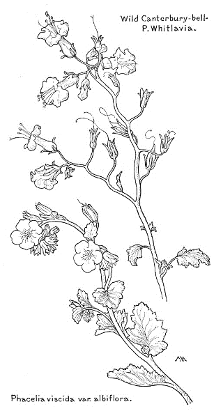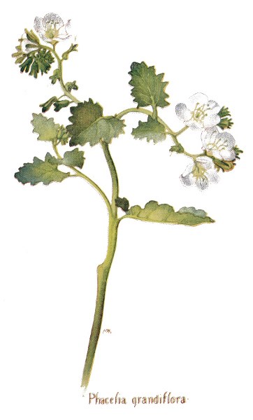 This is a white variety, with pretty, delicate white flowers. Phacelia viscida is very much like P. grandiflora, and has about the same range, but is not so large a plant, usually about a foot tall, with smaller flowers, about an inch across. The corollas are blue, with purple or white centers.