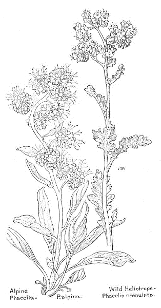 This just misses being a very pretty plant, for the leaves are attractive, but the flowers are too small and too dull in color for the general effect to be good. The stems are about ten inches tall, purplish and downy, and the leaves are dull green and rather downy, with conspicuous veins. The buds are hairy and the flowers are lilac and crowded in coiled clusters, to which the long stamens give a very feathery appearance. This is found in the mountains, as far east as Montana and Colorado, and reaches an altitude of over twelve thousand feet.