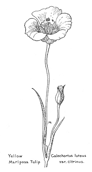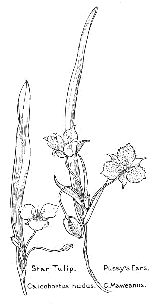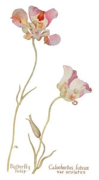 The commonest kind in northern California, found in both the Sierra Nevada and Coast Mountains, and one of the most beautiful of all the Mariposas. The broad petals, each about an inch and a half long, are usually white, lilac, or yellowish, with an "eye" like that on a peacock's feather, giving the name oculatus. Occasionally they are deep rose-color, as in the colored picture, though this is not typical, and have a vivid blotch of shaded maroon and crimson and an orange spot on each petal, with some maroon-colored hairs at the base. The sepals are striped with pink and maroon and twist into spirals as they fade; the pistil and the blunt anthers are mauve; the honey-gland narrowly crescent-shaped; the leaves pale-green and the delicate stem over a foot tall. This Mariposa is extremely variable and seems sometimes to merge into C. venústus, a similar kind, and gorgeous varieties of both may be seen along the Yosemite road on the down grade to Wawona. There are many similar Mariposas, but the casual flower-lover who finds any of these beautiful flowers will probably be satisfied to know that they are Butterfly Tulips, without going into the technical peculiarities which differentiate them.