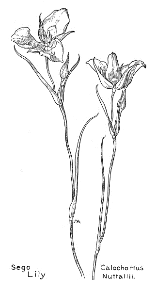 These pretty flowers are about two inches across, their white petals tinged with yellowish-green or lilac, and often delicately fluted at the edges, often with hairy spots inside the petals at their base, the whole flower very variable in coloring. These Mariposas grow all through the Southwest. In the Grand Canyon they begin to come out early in May, among the dry grasses halfway down the Bright Angel trail, and are a lovely shade of clear lilac. The slender stem, about a foot tall, often bears a small bulb near the base. It is called Sego Lily (pronounced Sègo) in Utah and is the "State flower." Its bulbs formed a substantial part of the food of the early Mormon pioneers when they crossed the desert and the flower is therefore held in great esteem in Utah.