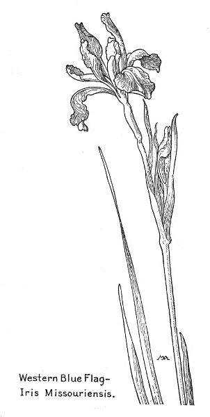 A beautiful kind, forming low clumps of many, very narrow leaves, from five to twenty inches long and much taller than the flower-stalks. The handsome flowers are over three inches across, bright purplish-blue, the sepals veined with darker color and marked with a white stripe. This is common on grassy hills near the coast and farther inland becomes taller and paler in color. The flowers are slightly sweet-scented and begin to bloom in January. The Hupa Indians used the leaves for making twine and rope for their nets and snares. There are many other beautiful western Irises.