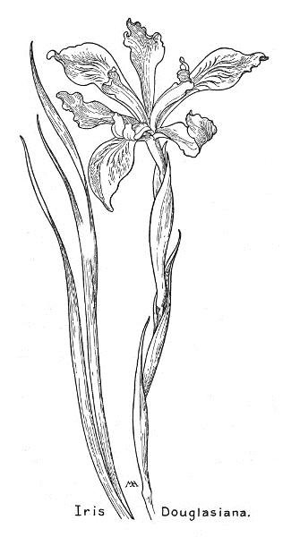 A very handsome and decorative plant, growing in large clumps, in damp situations, from stout, creeping rootstocks. The stiff, sword-shaped leaves, mostly shorter than the stems, are smooth and light bluish-green and the stout stems, from one to two feet high, bear usually two, pale-violet flowers, about three inches long, emerging from thin, papery bracts. The sepals are white, or pale blue, delicately veined with violet, with a yellow-veined rib down the middle, the petals are pale blue or pale violet, veined with purple, and the buds are yellowish, veined with brown. This grows in profusion in the Yosemite meadows, at the foot of El Capitan, and is delicately beautiful, but would be more effective if the coloring were a little stronger.