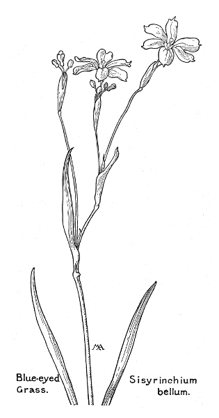 There are numerous kinds of Sisyrinchium, attractive little plants, all American, many from South America; with fibrous roots; grasslike leaves; slender, flat stems, sometimes branching; papery and green bracts and pretty flowers, that soon wither, on very slender pedicels, the six spreading divisions all alike; the filaments of the stamens united; the style branches slender, the capsule roundish, containing round seeds.