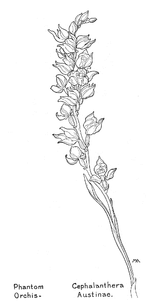 There is only one kind of Cephalanthera in North America; with creeping rootstocks; flowers in terminal spikes, with bracts; sepals and petals nearly equal; petals somewhat united and hooded; lip more or less pouched.