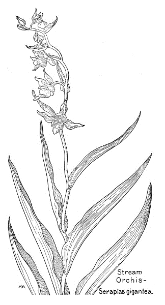 A handsome plant, decorative and curious in form and unusual in coloring. It is from one to four feet tall, with a stout, leafy stem bearing three to ten flowers and smoothish leaves, with prominent veins. The sepals are reddish or greenish-yellow and the petals pinkish, veined with maroon. The lip is pouched at the base, with a winged margin and a pendulous tip, which swings freely as if on a hinge, so that it quivers when the plant is shaken. Although the flowers are very handsome this curious tremulous motion, which makes them seem almost alive, gives them a quaint likeness to an old woman in a sunbonnet, with a hooked nose and chattering jaw. They have a slight scent and the plant is quite common along streams and in wet places, in the West and in Colorado and Texas. Some botanists think it is identical with a variety which grows in the Himalaya Mountains. It was named for the Egyptian deity, Serapis.
