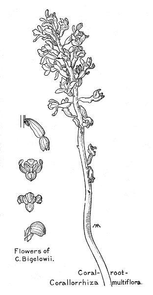 There are several kinds of Corallorrhiza, widely distributed in the north temperate zone and growing in dense woods; pinkish or straw-colored plants, more or less parasitic, with large roots resembling branches of coral; the leaves all reduced to sheathing, papery scales; the flowers in terminal racemes, without bracts, on short pedicels, which turn down in fruit, mostly with a short spur, the sepals and petals about equal, the upper ones curving in.