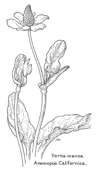 This plant bears several, large, cream-white flowers, which at the first glance appear to have from five to eight petals and a long, projecting knob in the center, but what appears to be a corolla is in reality an involucre, about an inch and a half across, and surrounding the base of a long, conical spike of numerous, small, greenish flowers. These are half-sunk in the fleshy substance of the spike and have no sepals or petals, but each has a small, white bract at its base, so that the spike appears to be covered with scales symmetrically arranged. The flower has from six to eight stamens on the base of the ovary and from three to four stigmas. The ovaries, which are superior, form small pods, opening at the top when ripe, so that in the end the spike is neatly pitted with holes. The rather thick, hollow, reddish stems are from six inches to two feet tall, covered with hair, and the smooth, light-green leaves, from two to ten inches long, are mostly from the root, with leaf-stalks which broaden at the base and partly sheathe the stem. The creeping rootstocks are peppery and acrid, used medicinally, and considered exceedingly valuable by Spanish-Californians. These pretty, odd-looking plants grow in alkaline or salty swamps in the south. The name is from the Greek meaning "anemone" and "appearance," but the flowers do not look very much like Anemones.