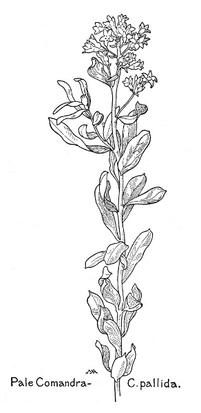 There are four kinds of Comandra, one of them European; smooth, perennial herbs, with alternate leaves, and flowers in clusters, without bracts. The calyx is more or less bell-shaped, usually with five lobes, its tube lined with a disk, the stamens inserted at base of the lobes and the anthers attached to the lobes by tufts of hairs.