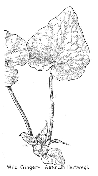 The handsome leaves of this perennial are its conspicuous feature. They have long, hairy leaf-stalks and are heart-shaped and toothless, from three to five inches broad, dark rich green, prettily veined and often also beautifully mottled with white, smooth on the upper surface and hairy on the under. We notice them immediately in the damp, dark woods they live in, but unless we look carefully we miss the single, large, strange, purplish-brown flower, the color of dead leaves, which nestles close to the ground as if trying to hide itself. This has twelve stamens, with stout filaments, and six styles, united at the base. There are no petals, but the hairy calyx has three lobes, which are sometimes an inch and a half long, and have long points like tails. The seed-vessel is roundish, crowned by the withered calyx and stamens. The rootstock cannot be used as a substitute for ginger, but smells and tastes very aromatic and pungent. This resembles the Wild Ginger of the East, but is handsomer.